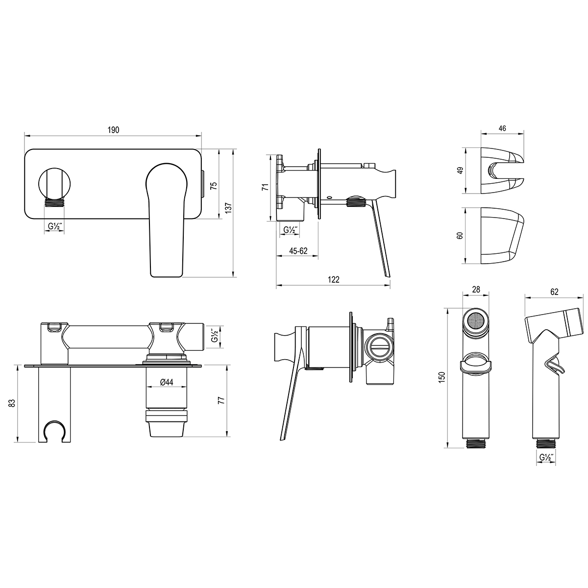- Аксессуары в комплекте (лейка гигиенического душа с регулятором напора воды, переключение для душевого шланга с креплением для лейки, душевой шланг 1,2 м)